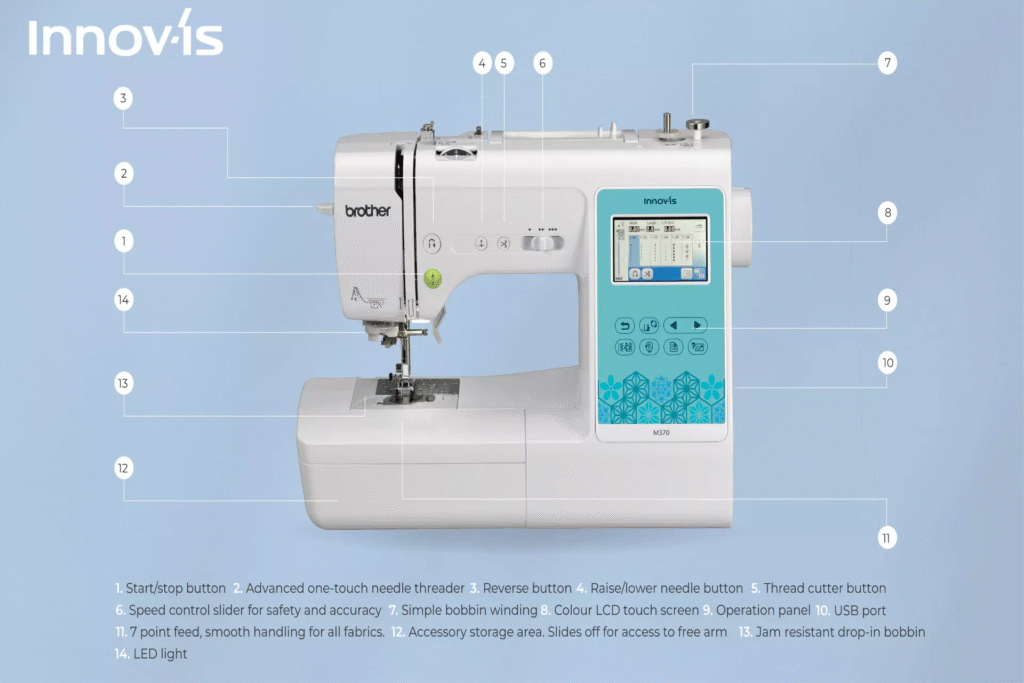 You’ll love how easy the Innov-is M370 Combination Sewing & Embroidery Machine is to use, and how jam-packed it is with exciting features. It’s the ideal machine for hobbyists from beginners to advanced sewers. With 181 built-in stitches and 135 embroidery designs, you can decorate and personalise your projects at the touch of a button. The M370 is the perfect size for transporting and taking to classes as well. With the wifi connection, you can transfer embroidery designs quickly and easily. The advanced automatic needle threader makes threading the needle a breeze and the LCD colour touch screen offer on screen editing, making it easy to adjust your designs and combine them with text or other designs to make something unique.